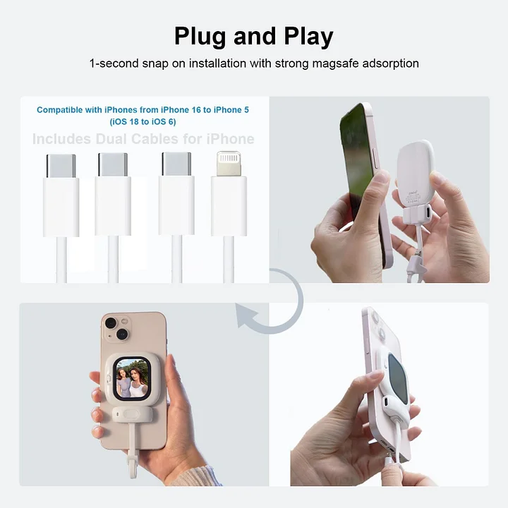 Valós idejű képernyőtükrözés hátlapi kamerás szelfikhez - Azonnali plug-and-play vezetékes kapcsolat iPhone-nal a valós idejű képernyőtükrözéshez késleltetés nélkül. Használd a hátlapi kamerát az élesebb képért, mint az előlapi kamera. Tökéletes TikTokhoz és élő közvetítéshez.
