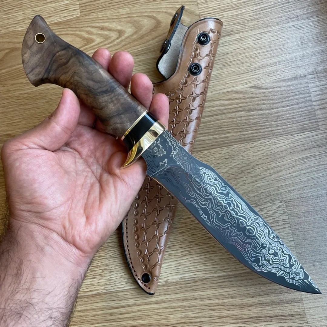 Kézzel készített damaszkuszi acél penge, amely vadászathoz, kempingezéshez, nyomkövetéshez és szabadtéri barkácsoláshoz alkalmas