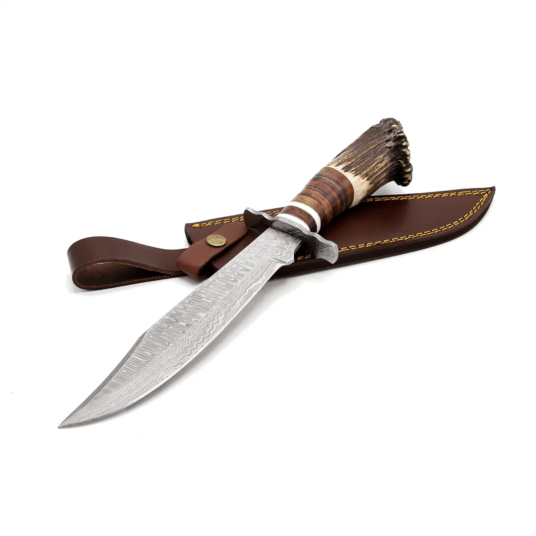 Ez a kézzel készített vadászkés elefántcsont szarvból és természetes bőrből készült nyéllel rendelkezik. Vadászkés, túlélőkés, valamint nagyszerű ajándék férfiaknak vagy ifjú házasoknak.